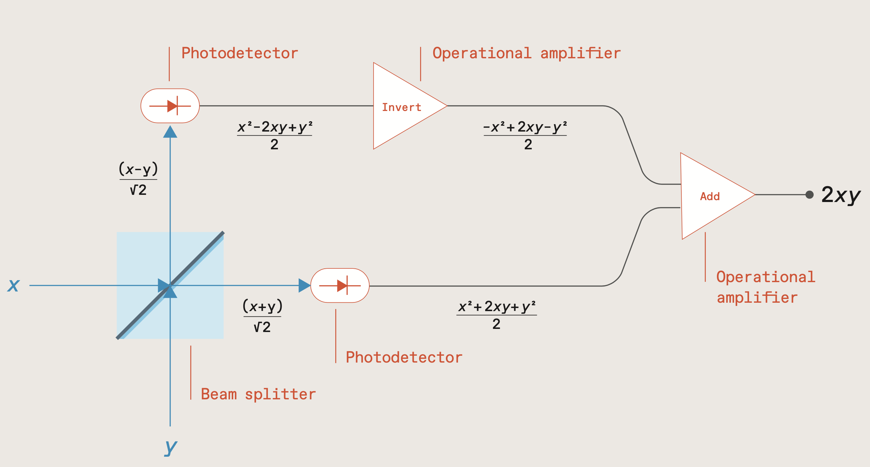 Multiplying with Light. Hamerly describes how photonic multiplication operates: “Two beams whose electric fields are proportional to the numbers to be multiplied, x and y, impinge on a beam splitter (blue square). The beams leaving the beam splitter shine on photodetectors (ovals), which provide electrical signals proportional to these electric fields squared. Inverting one photodetector signal and adding it to the other then results in a signal proportional to the product of the two inputs.”