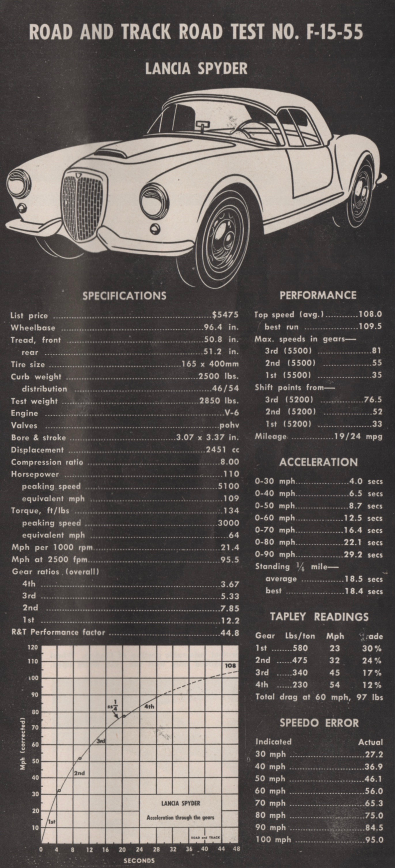 And in 1955. R&T, November 1955, celebrated introduction of a two-seat roadster from the marque, the Lancia Spyder: “The Spyder derives component-wise from the much respected Aurelia Gran Turismo model which first appeared in Europe in 1951. Integral chassis-body construction is used on both cars, but the Spyder has a wheelbase shortened by 7 3/4 in. Pinin Farina (of Nash fame!) has given the new car a trim, steel body—pleasing if not distinctive—but has retained the familiar shield-shaped Lancia radiator grille.”
