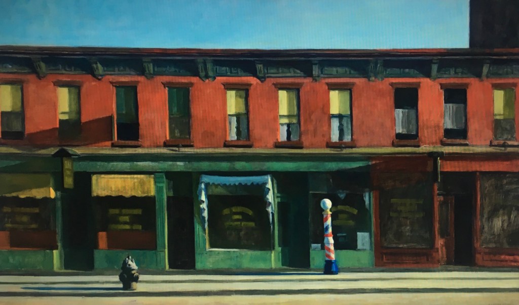 “He peers in at private apartments from elevated trains,” she notes, “and surveys his own neighborhood from rooftops. He turns offices, restaurants and movie theaters into stages for just one or two actors. He paints windows and storefronts without glass, as if he could just reach in and touch the people and things inside.”