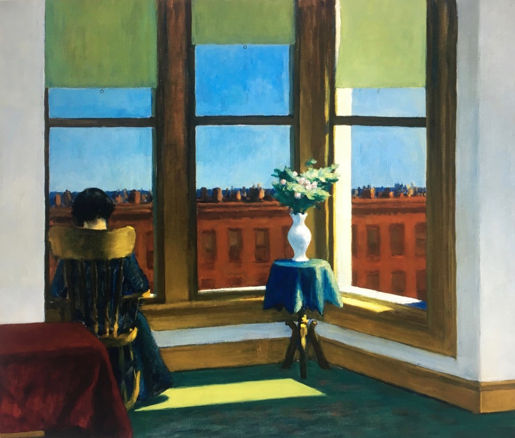 A Room with a View. In this sunlit setting, Rosenberg writes, “The artist left out the Brooklyn Bridge, and most of Brooklyn, focusing on an interior and a low-rise exterior view.”