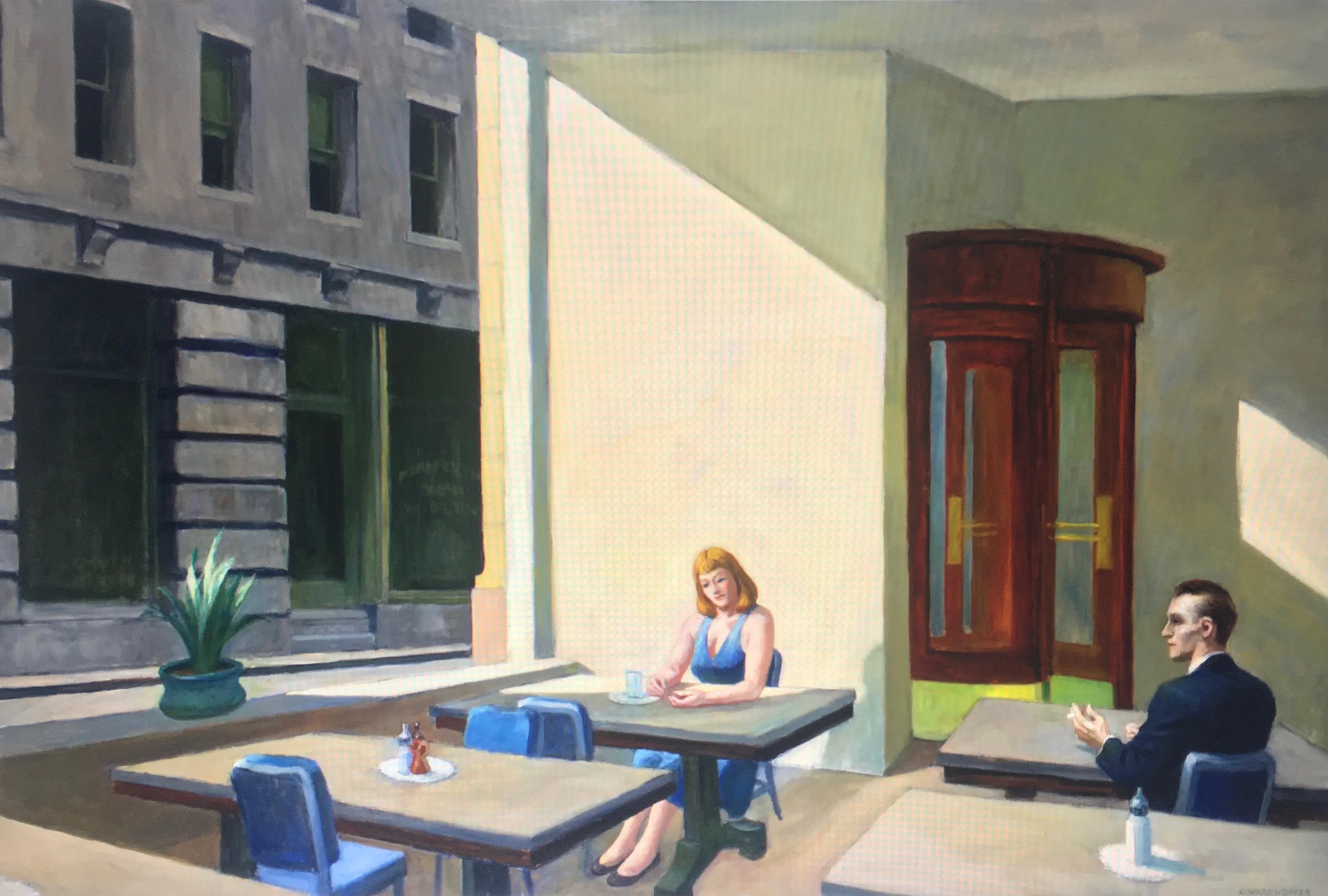 The artist’s familiar Nighthawks has recurred here at SimanaitisSays, indeed, once as inspiration for an opera set.