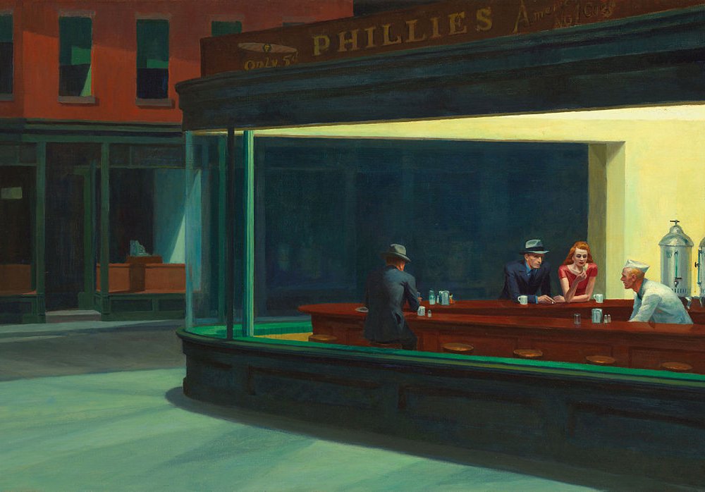 “He peers in at private apartments from elevated trains,” she notes, “and surveys his own neighborhood from rooftops. He turns offices, restaurants and movie theaters into stages for just one or two actors. He paints windows and storefronts without glass, as if he could just reach in and touch the people and things inside.”
