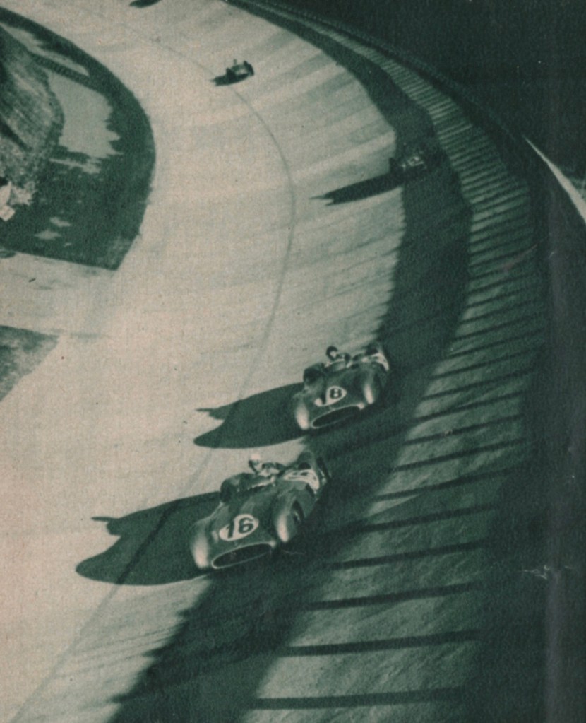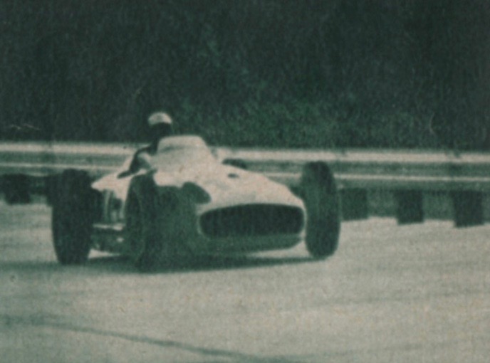 Stirling Moss’s Drive. Bernard described, “Twenty-two cars took flight and at the end of the half lap, at the point where the road circuit passes a second time in front of the grandstands and branches off into the speedway part, Moss was in the lead. However by the time the whole lap was finished, the maestro, Fangio, had taken over….”