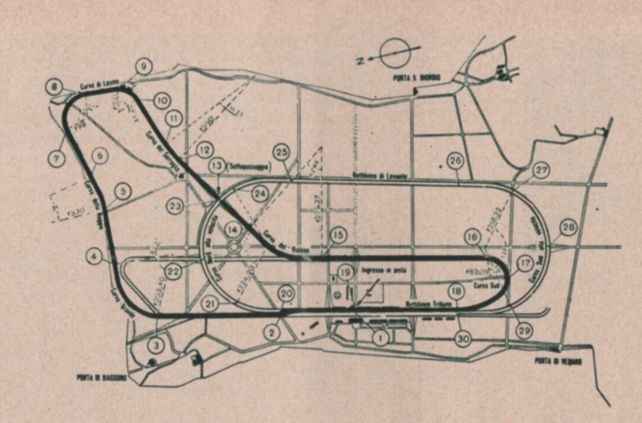 A New Circuit. Bernard wrote in R&T, December 1955, “Indeed, Monza was inaugurating a new type of track, six miles long, a combination speedway and road circuit, each part having roughly the same length, and the total resulting in the fastest road circuit in the world.”