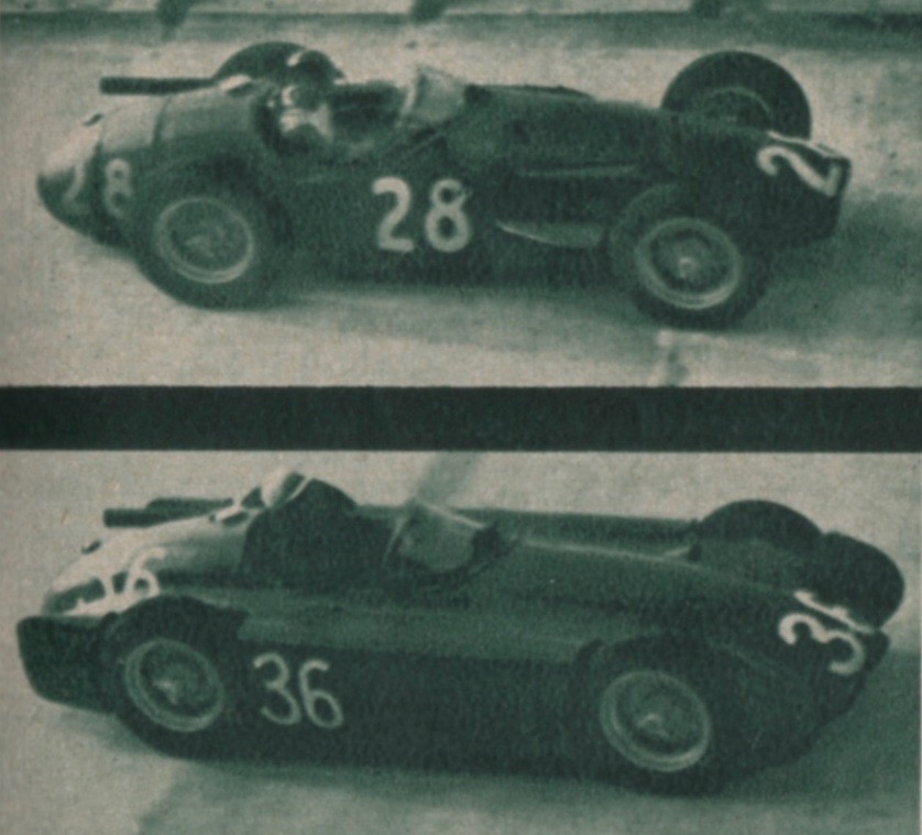 Behra’s Streamliner’s Fate. “During the last 15 laps of the race,” Bernard reported, “Behra, pushing his Maserati to the maximum, tried to catch up with Castellotti for the third place. Gradually he cut down the gap to 22’’ but two laps before the end he broke a piston and finished those laps putting along, lucky to be able to cross the finish line still holding his place and issuing a great cloud of smoke.”
