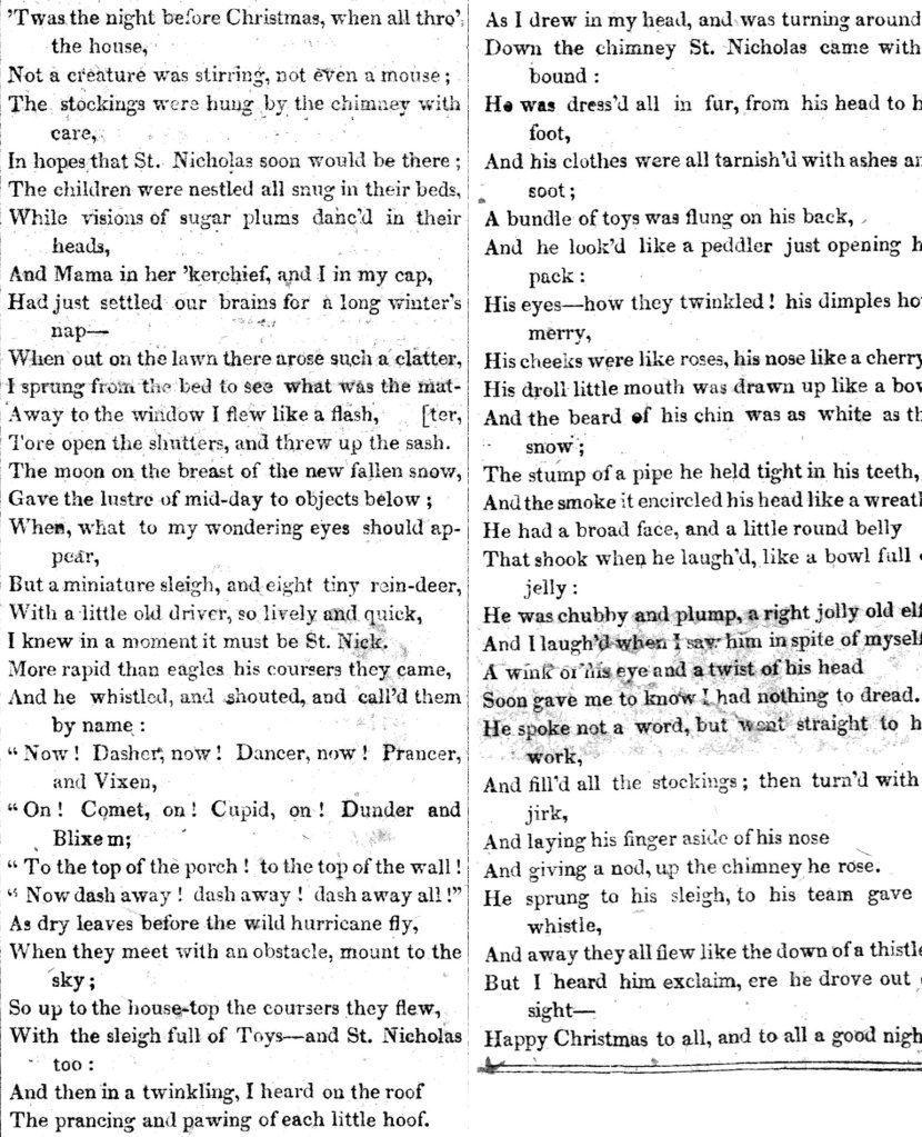 The original publication of Account of a Visit from St. Nicholas in the Troy Sentinel, December 23, 1823, from Wikipedia.