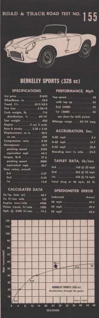 A Contemporary Brit View. Wikipedia notes, “Motor magazine tested a 328 cc Berkeley in 1957 and found it to have a top speed of 62.1 mph (99.9 km/h) and acceleration from 0-50 mph (80 km/h) in 30.6 seconds. Fuel consumption of 58.3 miles per imperial gallon (4.85 L/100 km; 48.5 mpg U.S.) was recorded.”