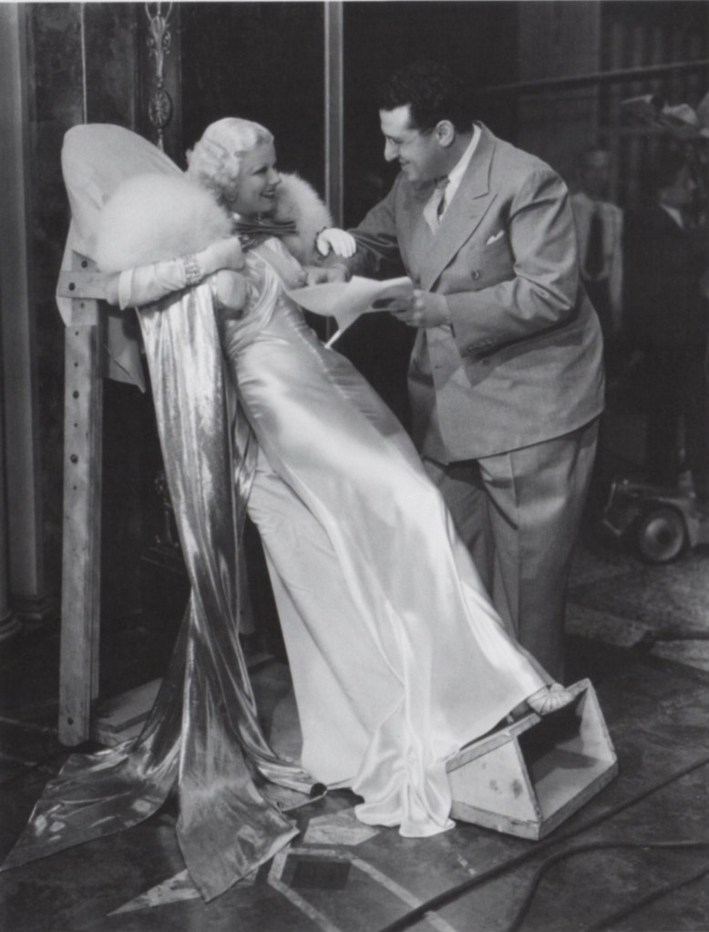 A Lean-to Break. Landis observes, “Jean Harlow’s slinky, body-hugging, bias-cut silk charmeuse gowns wrinkled so easily that she couldn’t sit down between takes—so prop men and costume designers developed the ‘slant board,’ which tilted at a 45-degree angle (complete with arm rests), allowing the actress to rest her legs and refresh her makeup without taking the time to remove the dress for steaming between takes.”
