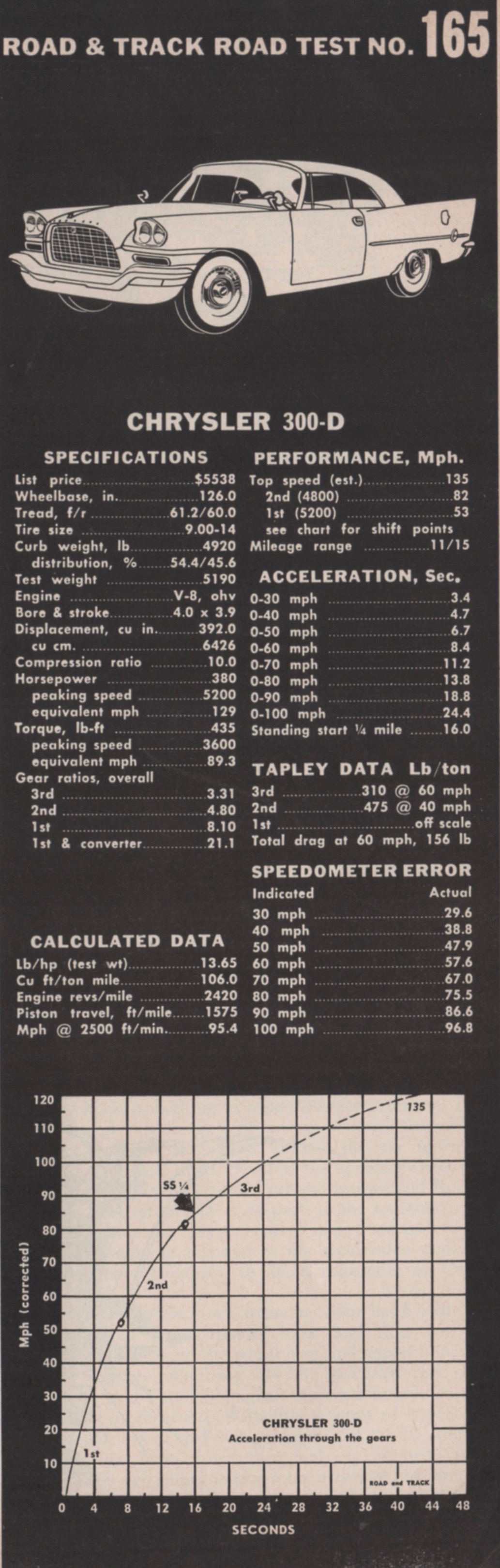 In all this accelerative exuberance, the R&T 300-D posted an average 11-15 mpg. Gasoline was 30¢/gallon in 1958, equivalent to about $3.12/gallon today.