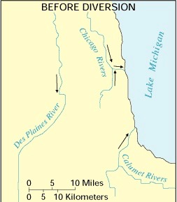The Chicago River. The river has been historically important as part of the Chicago Portage, a link between the Great Lakes, the Mississippi River Basin, and ultimately the Gulf of Mexico. North and south branches of the Chicago Rivers fed its main branch flowing into Lake Michigan. A few miles west, as part of the Mississippi River watershed, the Des Plaines River flowed south.