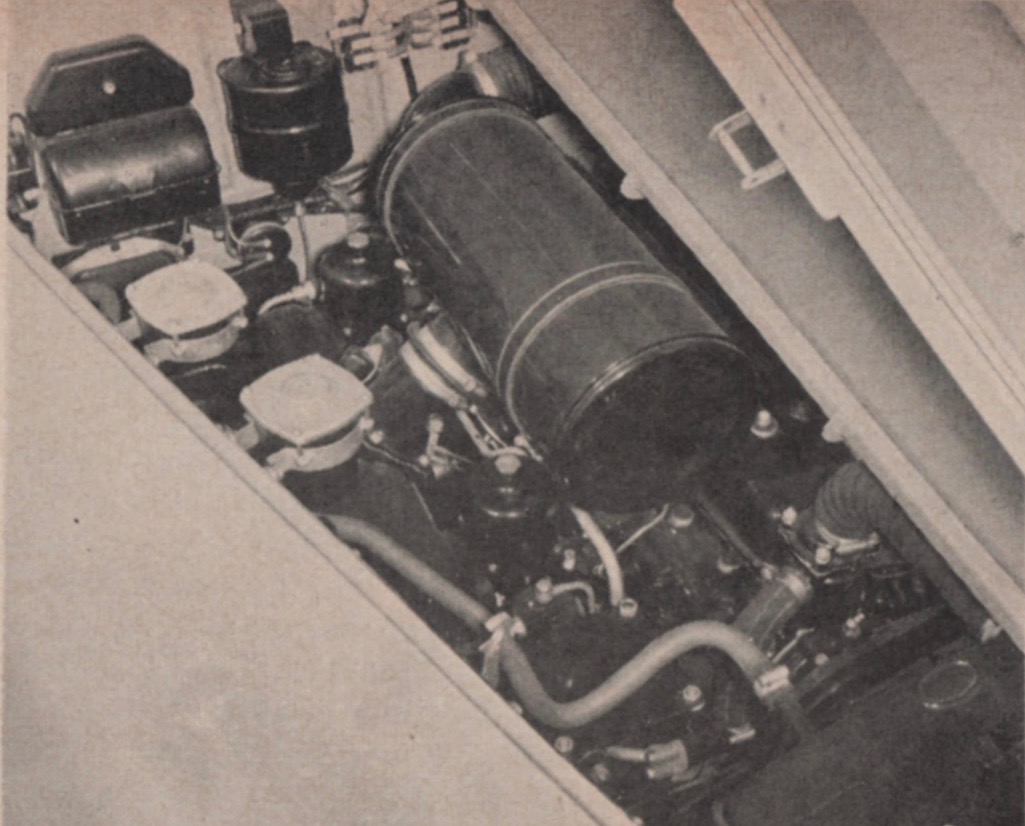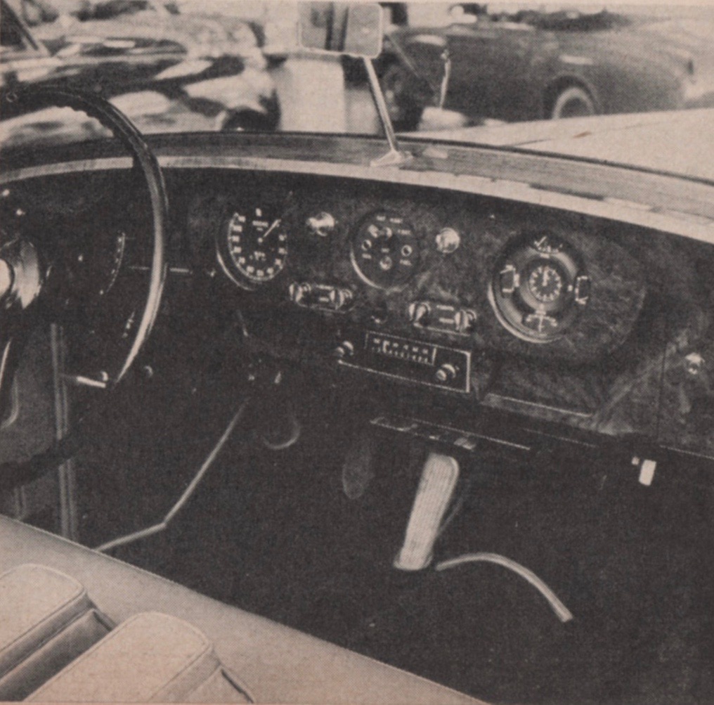 “The instrument panel,” wrote R&T, “is natural walnut and the instruments are sheer joy—legible white on black, with real calibrations which tell you exactly what you want to know. A multiplicity of panel-mounted controls take some learning, but this can be excused when you realize some of the unusual features available. To cite just a few, there are a plug for the battery charger, a release for the gas filler, an oil level indicator button, and a chassis lubricator pump.”