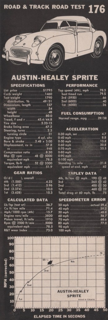 An R&T Summation. “We found the Austin-Healey Sprite a most significant and exciting new model. It fills the broad gap between the Berkeley and the MG-A with a genuine sports car…. It offers more fun per dollar than anything we have driven for a long time.”