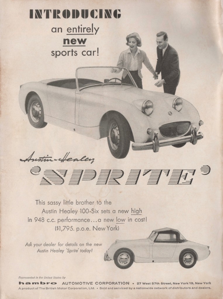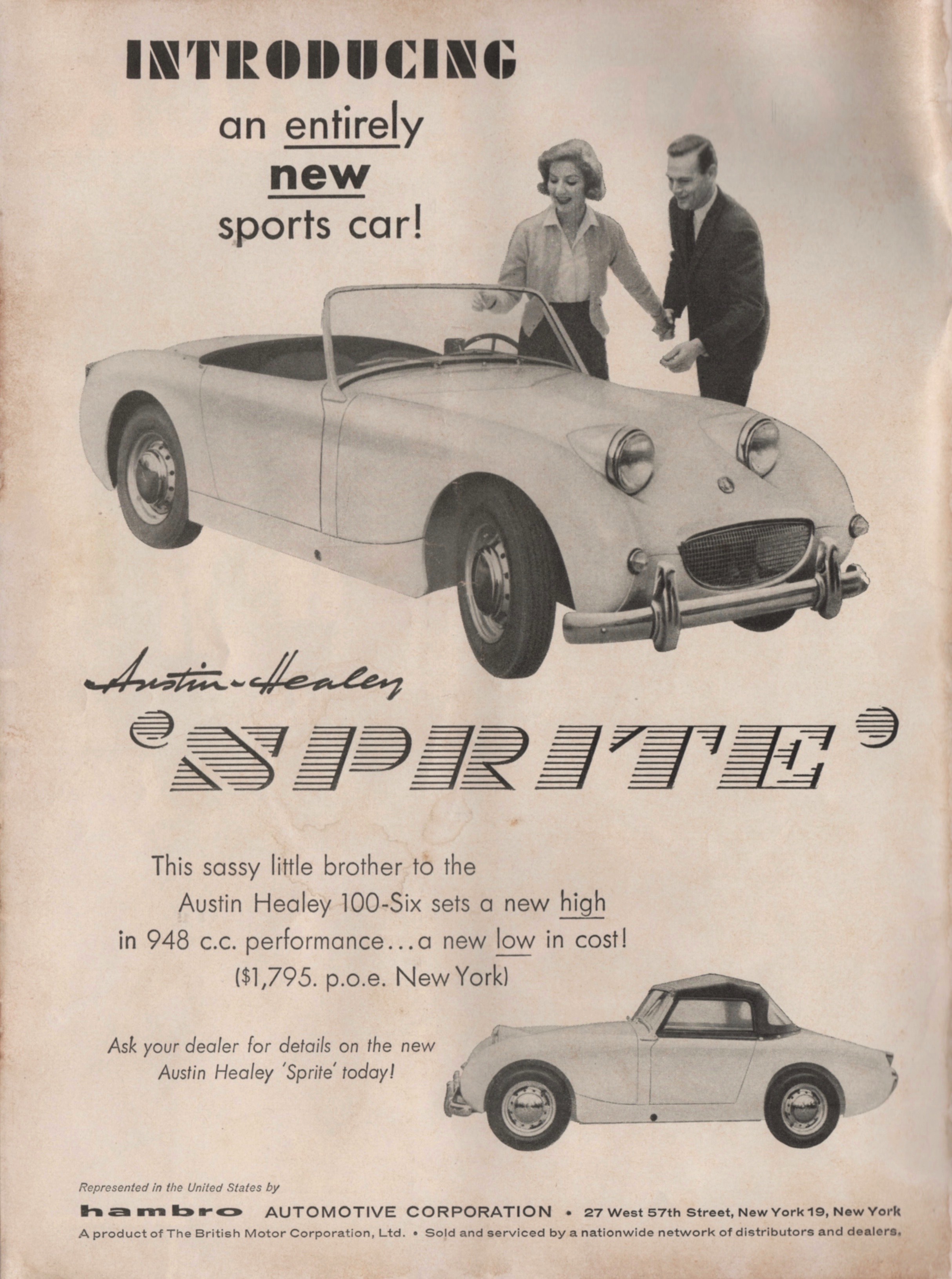 “This sassy little brother to the Austin Healey 100-Six sets a new high in 948 c.c. performance… a new low in cost! ($1,795. p.o.e. New York).”