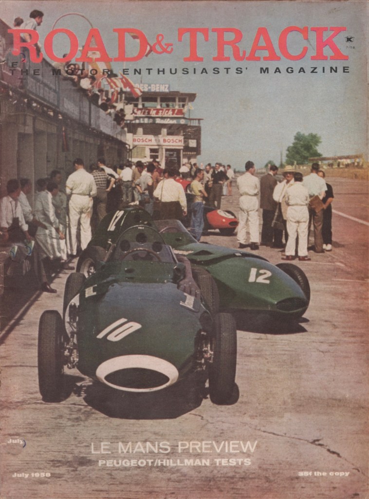 These thoughts came to me while perusing the July 1958 R&T, its cover showing Vanwall Formula 1 cars in the pits of Nürburgring. However, it was the inside front cover that caught my attention.