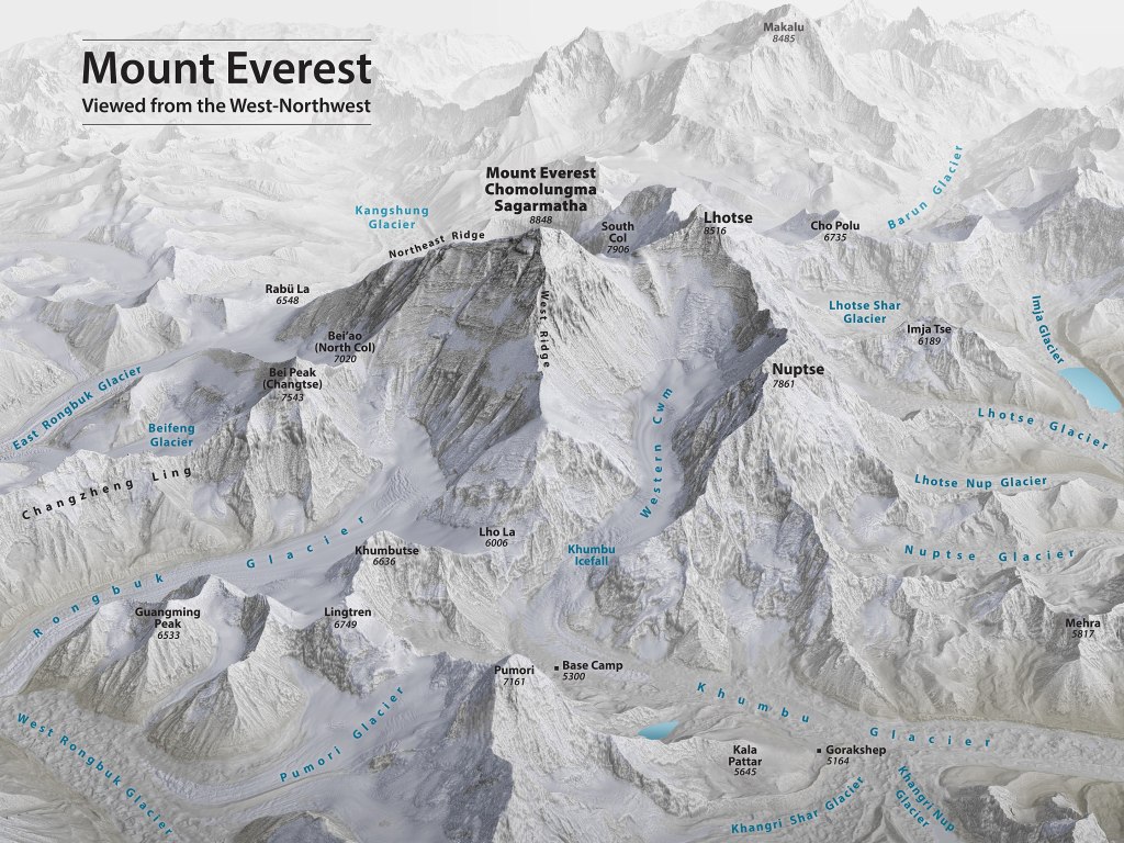 Note Everest peak, South Col, Khumbu Icefall and Base Camp. This and following images from Wikipedia.