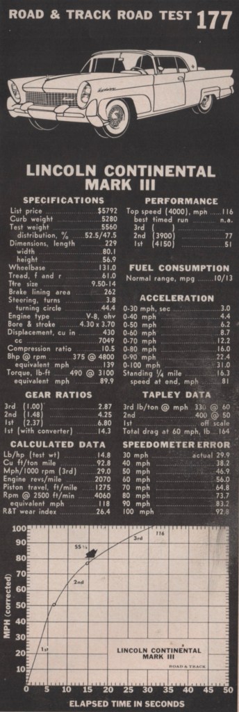 The Mark III. R&T reported, “The advent of the huge 1958 Lincoln around Road & Track’s offices created more controversy than we’ve experienced in years. Most of the staff opinions were slight variations of ‘What could anyone possibly want with that thing?”