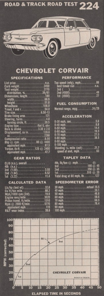 Away with a Myth. John stated, “All the gossip about this car’s dangerous handling characteristics can be dismissed. Summarized, this is how it handles: 1) It definitely understeers at all times. 2) The understeer is less than usual and the car is much easier to ‘hold’ in a high-speed bend. 3) The light understeer does not change with loading. It’s the same whether the driver is alone or had 5 other with him. 4) On total spin-out (or loss of all adhesion) the Corvair’s tail goes out and through the fence first (a nose-heavy car will generally go through the fence nose-first).”