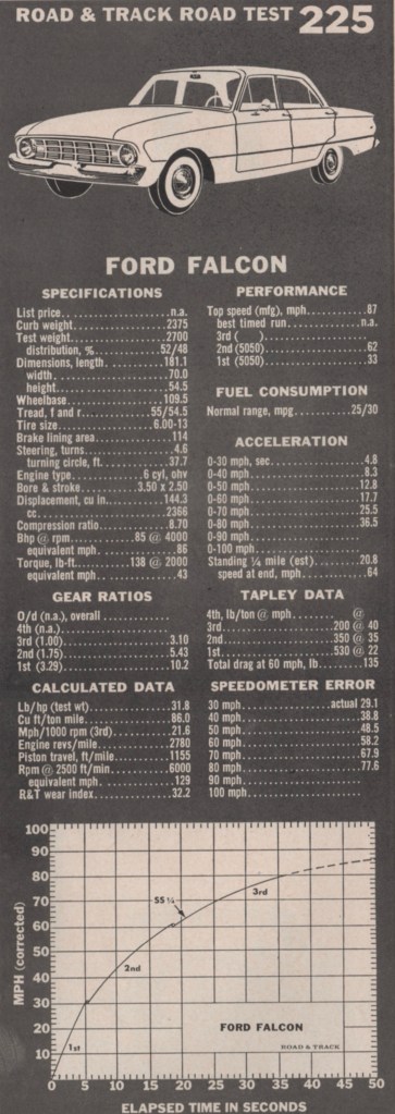 “To our minds,” John wrote, “the Falcon has two outstanding features. The first is the engine. It is smooth, quiet and has extraordinarily good torque…. The car feels like and is a very brisk performer: It will readily out-accelerate the standard 1959 Ford 6, by almost 2 sec to 60 mph to be specific.”