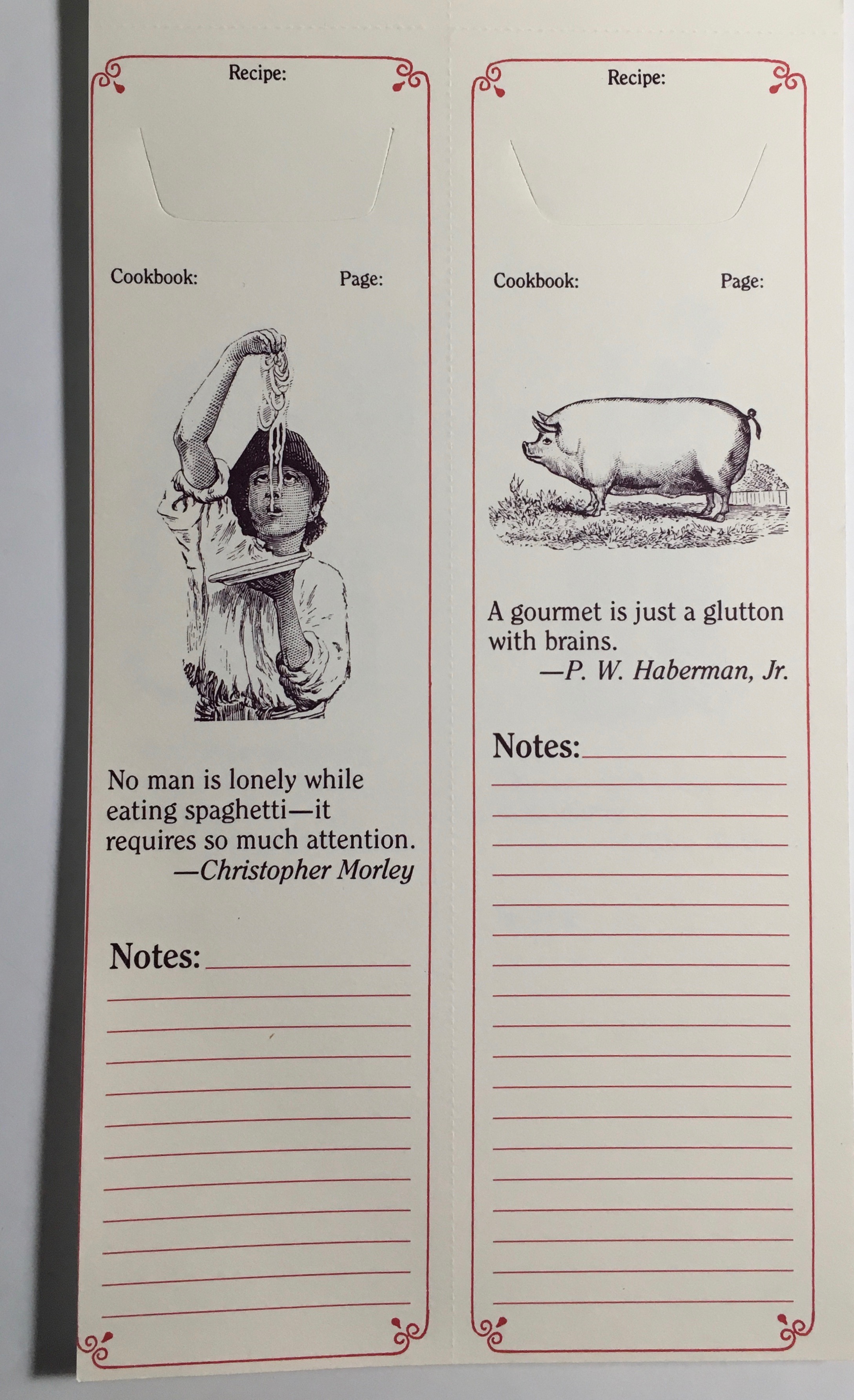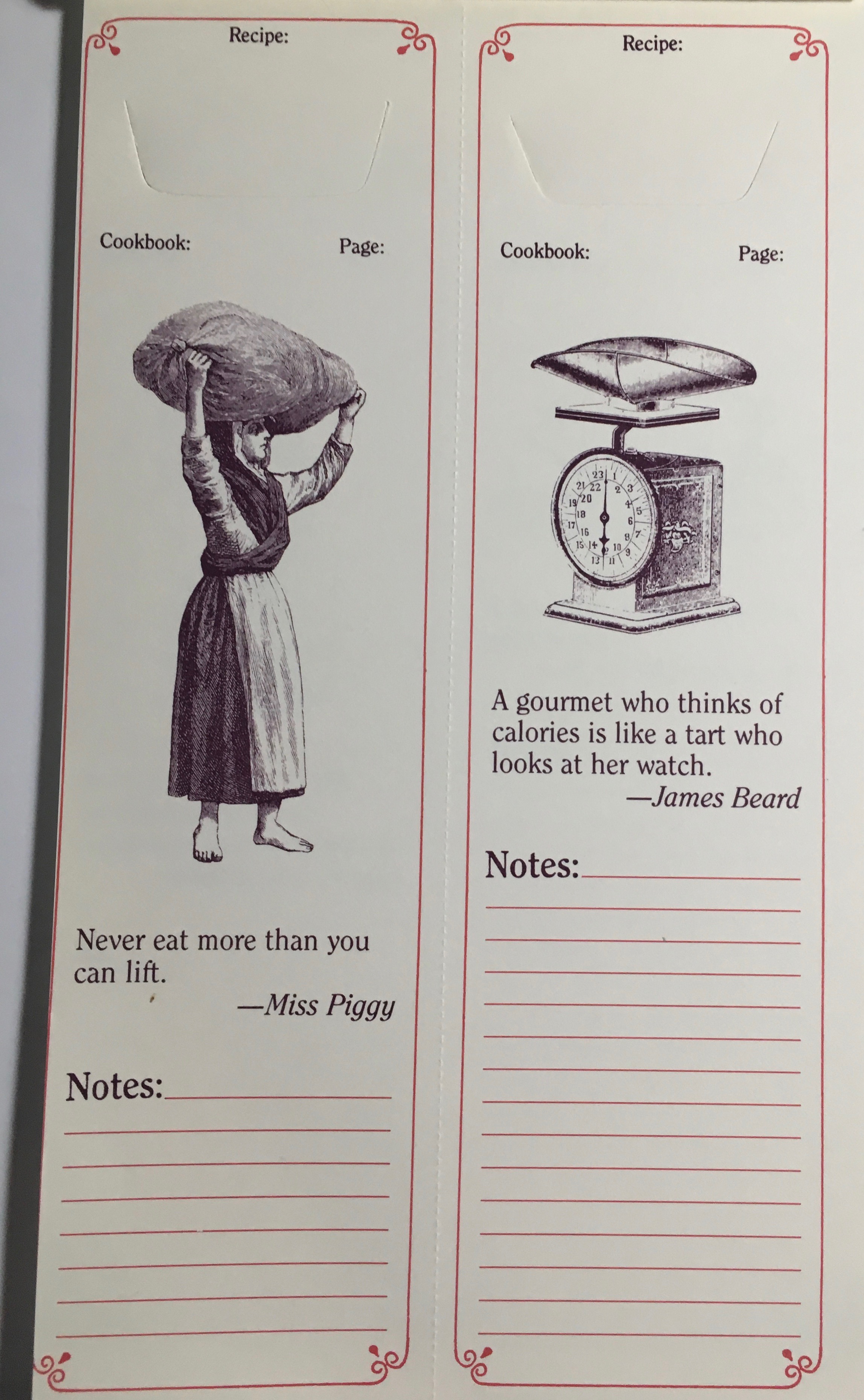 My edition, likely earlier than those offered at AbeBooks, has a horizontal format, albeit with a shared ISBN. As its title says, it consists of bookmarks, each adorned with illustration and pithy comment. To cite its proper use: “Locate a favorite recipe in your cookbook. Remove the bookmark at the perforations and write the name of the recipe at the top. Slip the tab over the page so that the name of the recipe is visible when you close the cookbook. Use the back of the bookmark to made additional notes: creative touches of your own; when you served the recipe and to whom; what you served with it, for better or worse.”