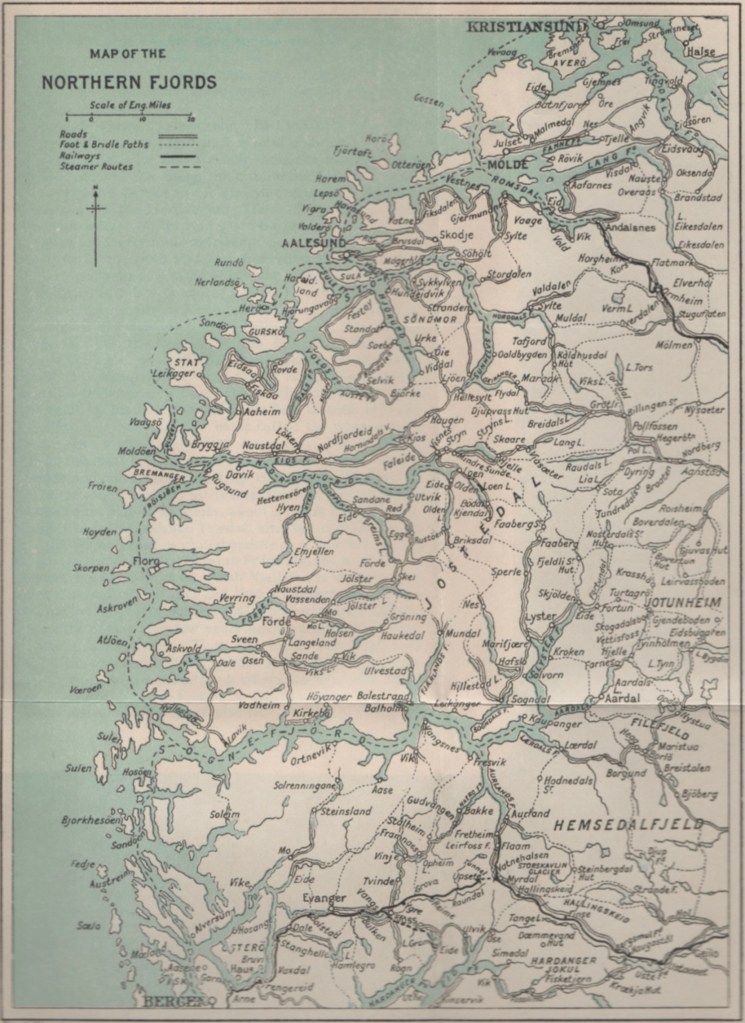 “In the course of a single day,” the guidebook observes, “one can transverse smiling valleys, lofty mountains, plateaux and snow-clad wilds, and sail on deep blue fjords…. In summer the Midnight Sun reigns supreme over a great part of the land, and in winter the star-gemmed sky is illuminated by the marvellous Northern Lights—the Aurora Borealis.”