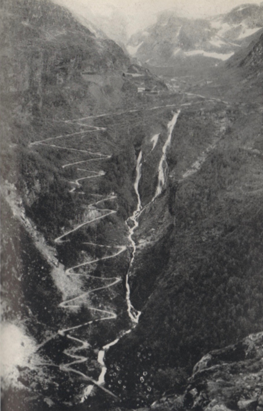 The Flăm Valley. Ward Lock recounts, “From Myrdal the road descends the Flămsdalskleiva by a number of sharp winds into the Flăm Valley, the mountains on either side rising to a great height. The scenery on the road through the bottom of the valley is as fine as anything on the Stalheim road, some would say finer; travellers having descended the winding road should look back at the route by which they have come.”