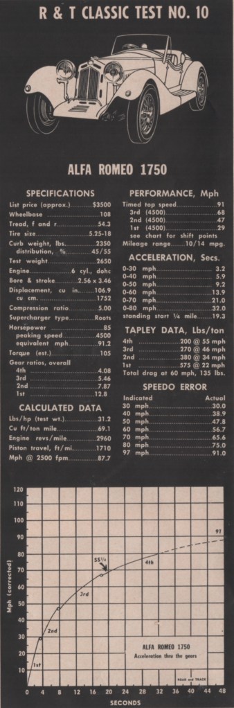 “CLASSIC TESTS” WERE AN R&T FEATURE for awhile, wherein editors would assemble data from contemporary sources and write a virtual road test of the classic era. The Bugatti Type 49 here at SimanaitisSays is an example. This Alfa Romeo 1750 Classic Test published in May 1957 is another.