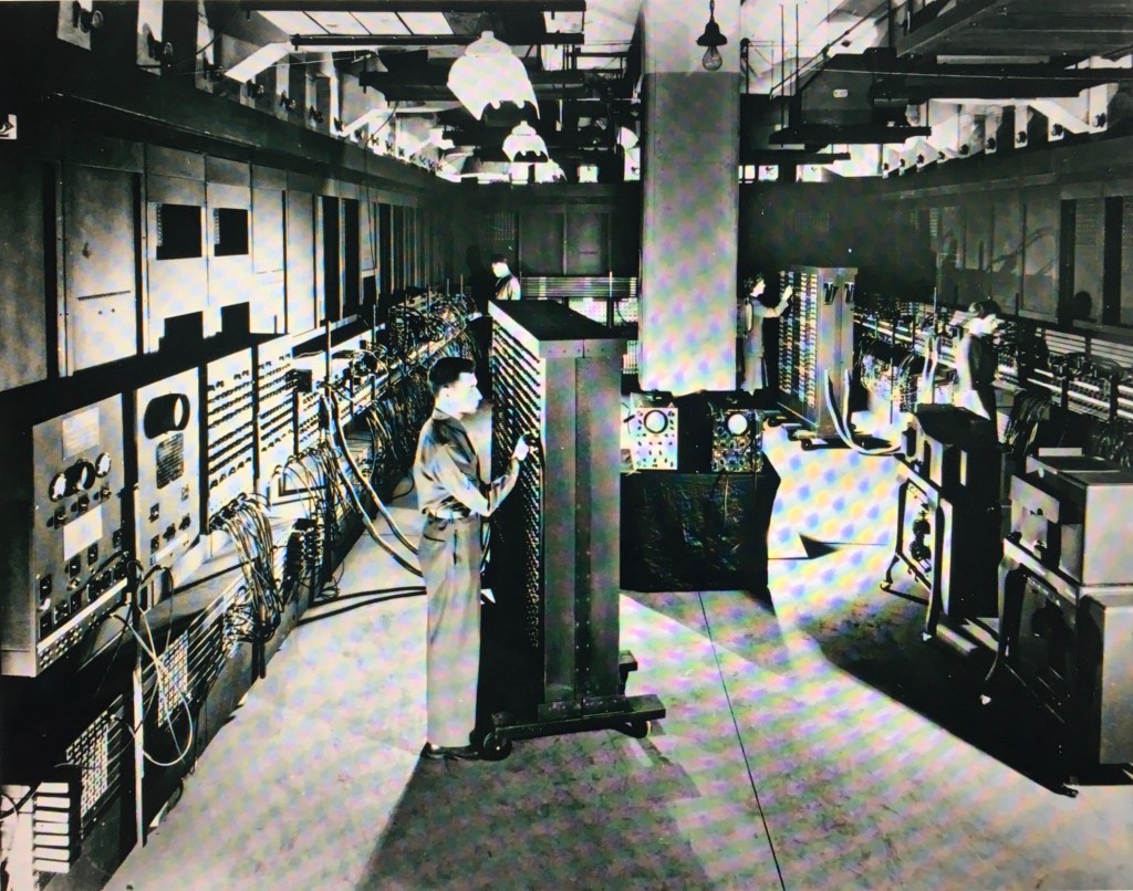 Lanchester observes, “The tubes made complex computations possible, but they were unwieldy, both prone to breakage and laborious to repair. ENIAC, the US army’s world-leading computer, introduced in 1946, used 18,000 vacuum tubes to calculate artillery trajectories faster and more accurately than any human. That made it revolutionary, but its utility was limited by the fact that it was the size of a room, and that whenever a single tube failed, which happened on average every two days, the whole machine broke down.”