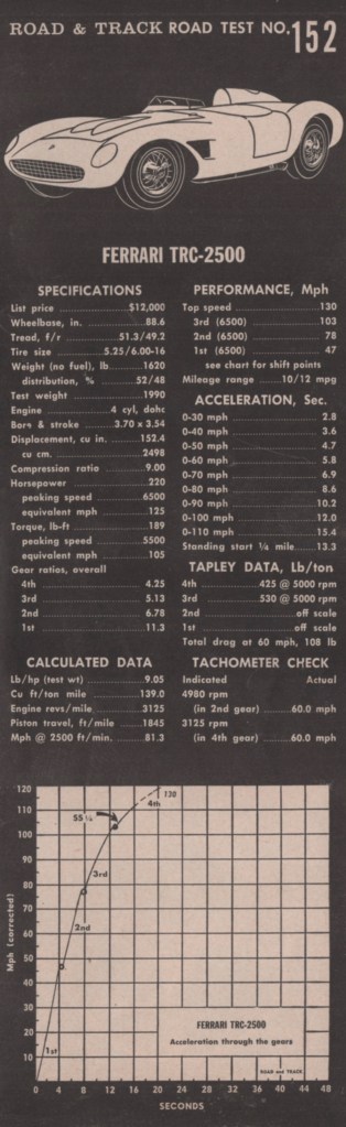 Summing Up. “As we said at the beginning of this report,” R&T concluded, “‘suitably impressed’ hardly covers the situation. The Ferrari TRC-2500 is without a doubt the most sensationally performing sports car we have ever tested—and we have tested more sports cars than any one person or organization that we know of.”