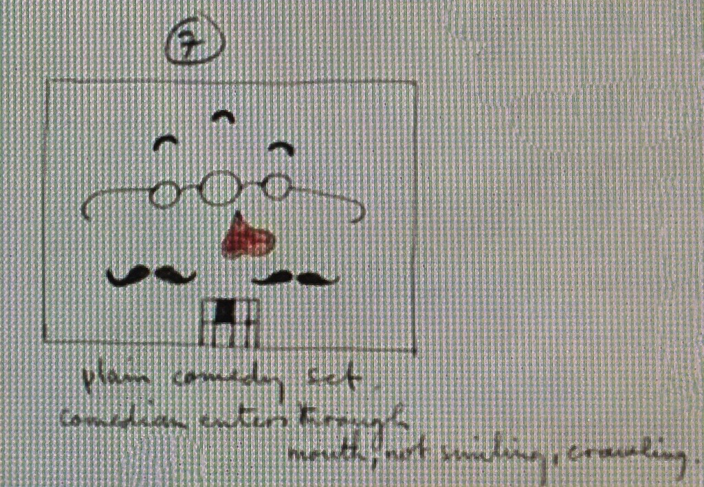 “Another design,” Long observes, “showed 12 mirrors for the audience to glimpse themselves in, while a further sketch with glasses and moustaches on the backdrop has the note: ‘Plain comedy set. Comedian enters through mouth, not smiling, crawling.’ “