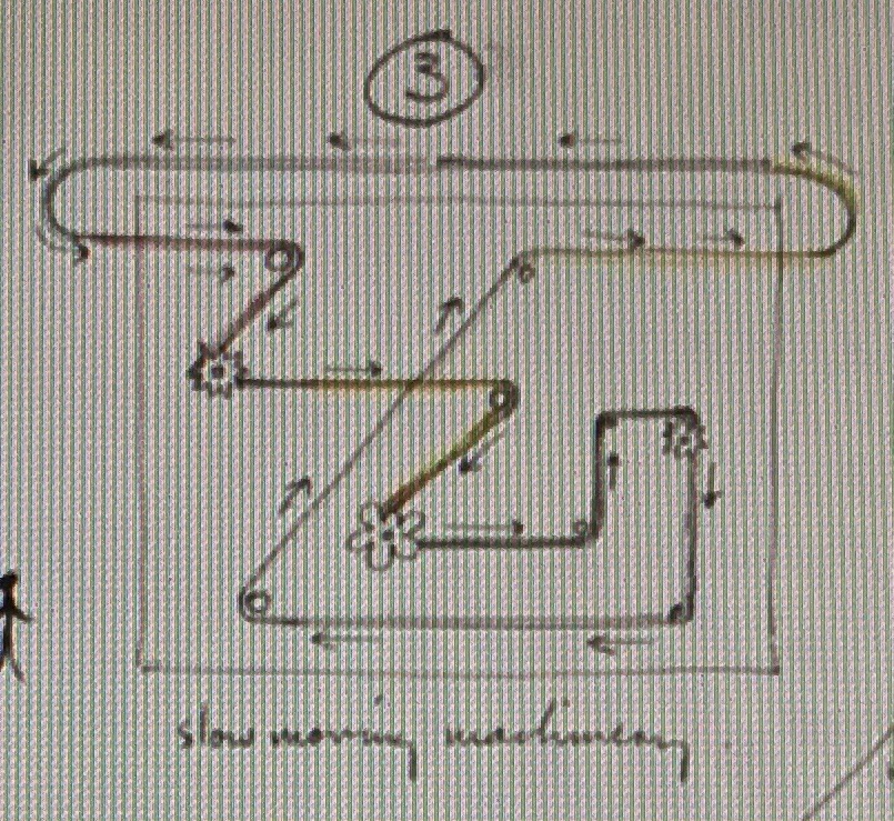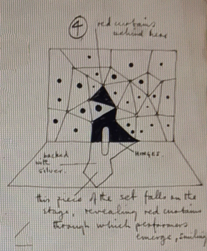 Long cites annotations in McCartney’s designs: “… one with a warning of ‘slow moving machinery,’ one with the note ‘this way up’ along side a sketch of an upside-down house, and another reading: ‘This piece of the set falls on the stage, revealing red curtains through which performers emerge, smiling.’ ”
