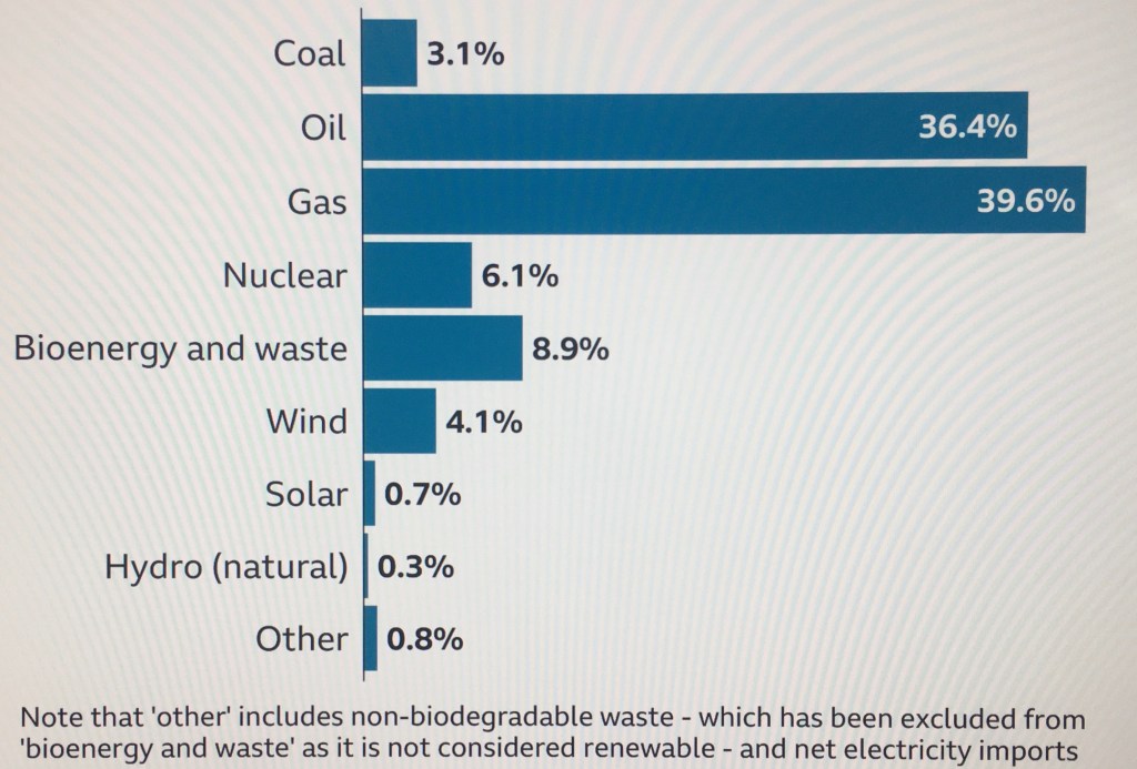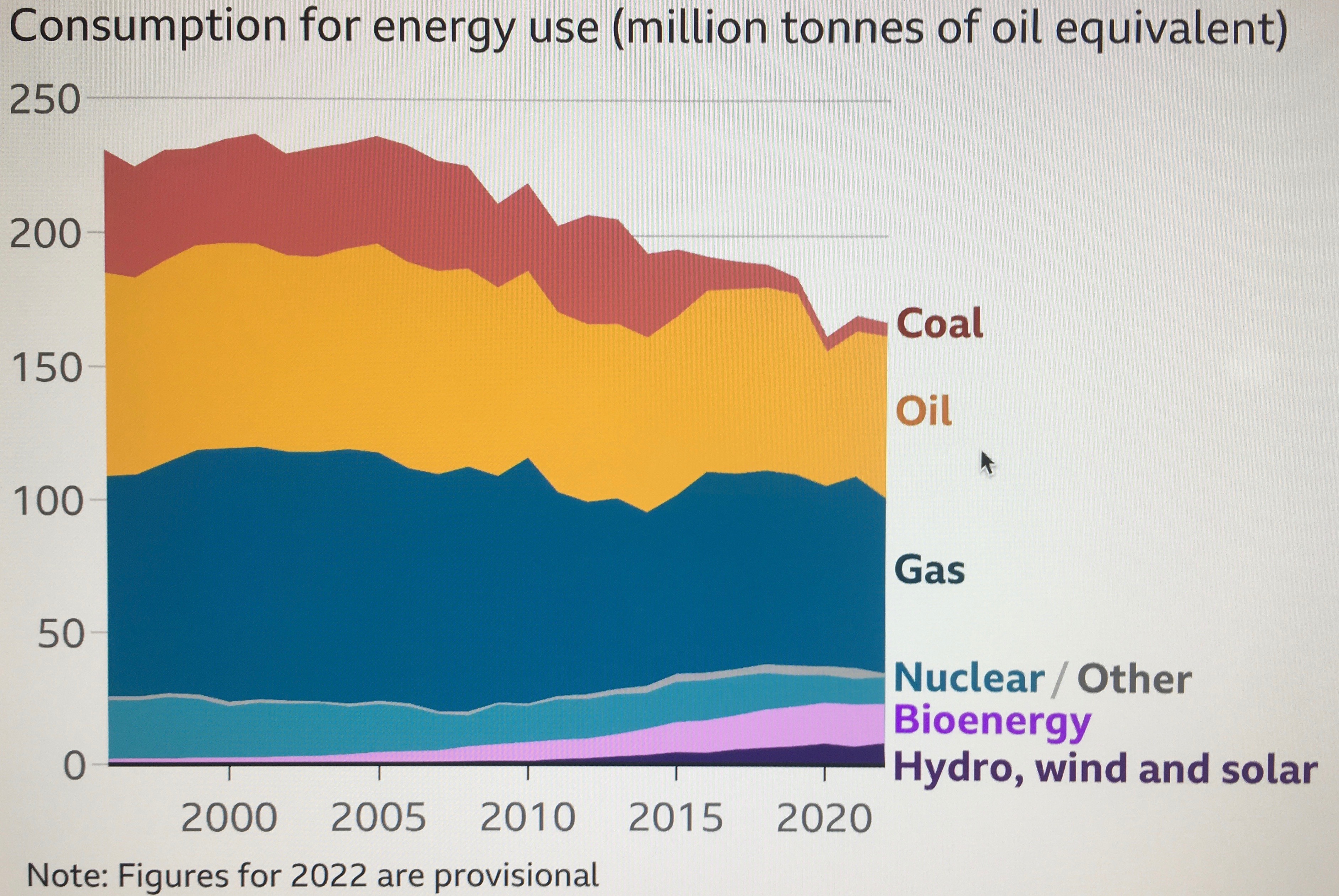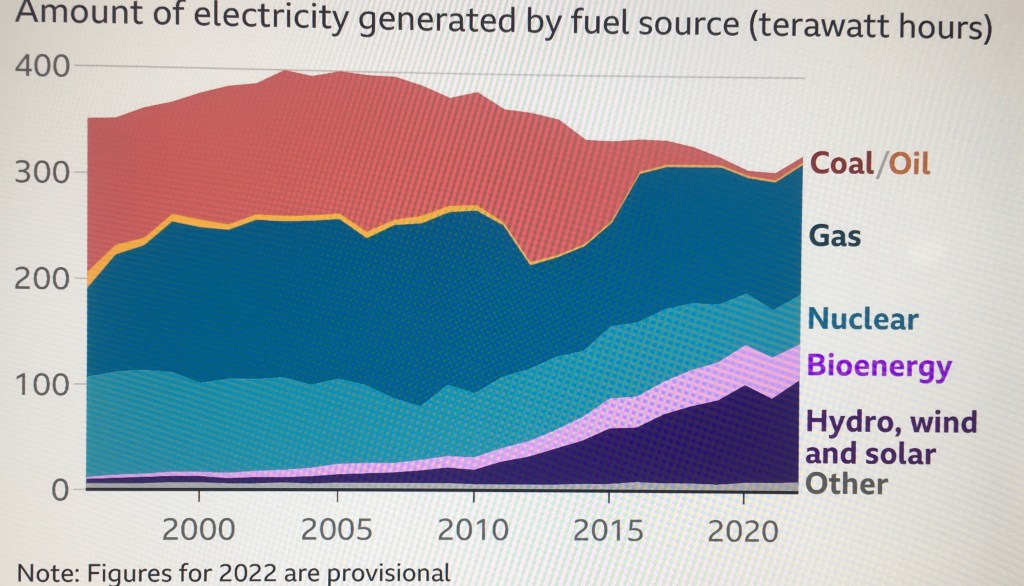 Electricity Only Part of an Energy Picture. Theo Leggett and Mark Poynting, BBC News, May 11, 2023, analyze “Renewables, Nuclear, and Fossil Fuels: The U.K.’s Changing Energy Mix.” They remind readers that “Energy is used for various purposes, including heating and powering homes, businesses, transport and industry. In 2022, the majority of the energy (79.1%) used within the UK came from fossil fuels (coal, oil and gas). This is down from 87.2% in 2012, mainly due to the declining use of the dirtiest fossil fuel, coal.”