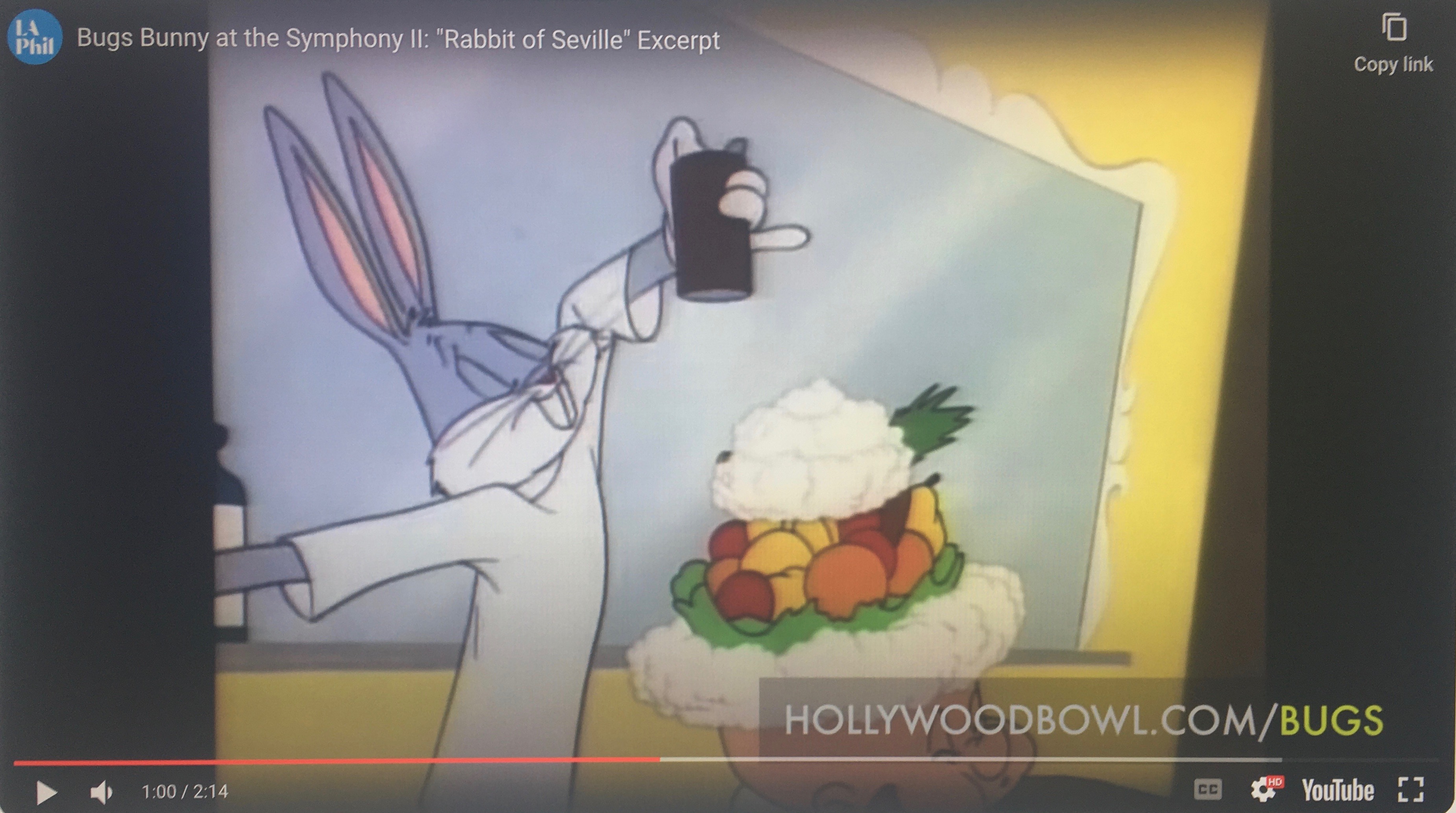 Bugs at Hollywood Bowl. Bugs and his pals have performed at Hollywood Bowl in “Bugs Bunny at The Symphony II,” a high point of which is his and Elmer Fudd’s famous rendition of “The Barber of Seville.”