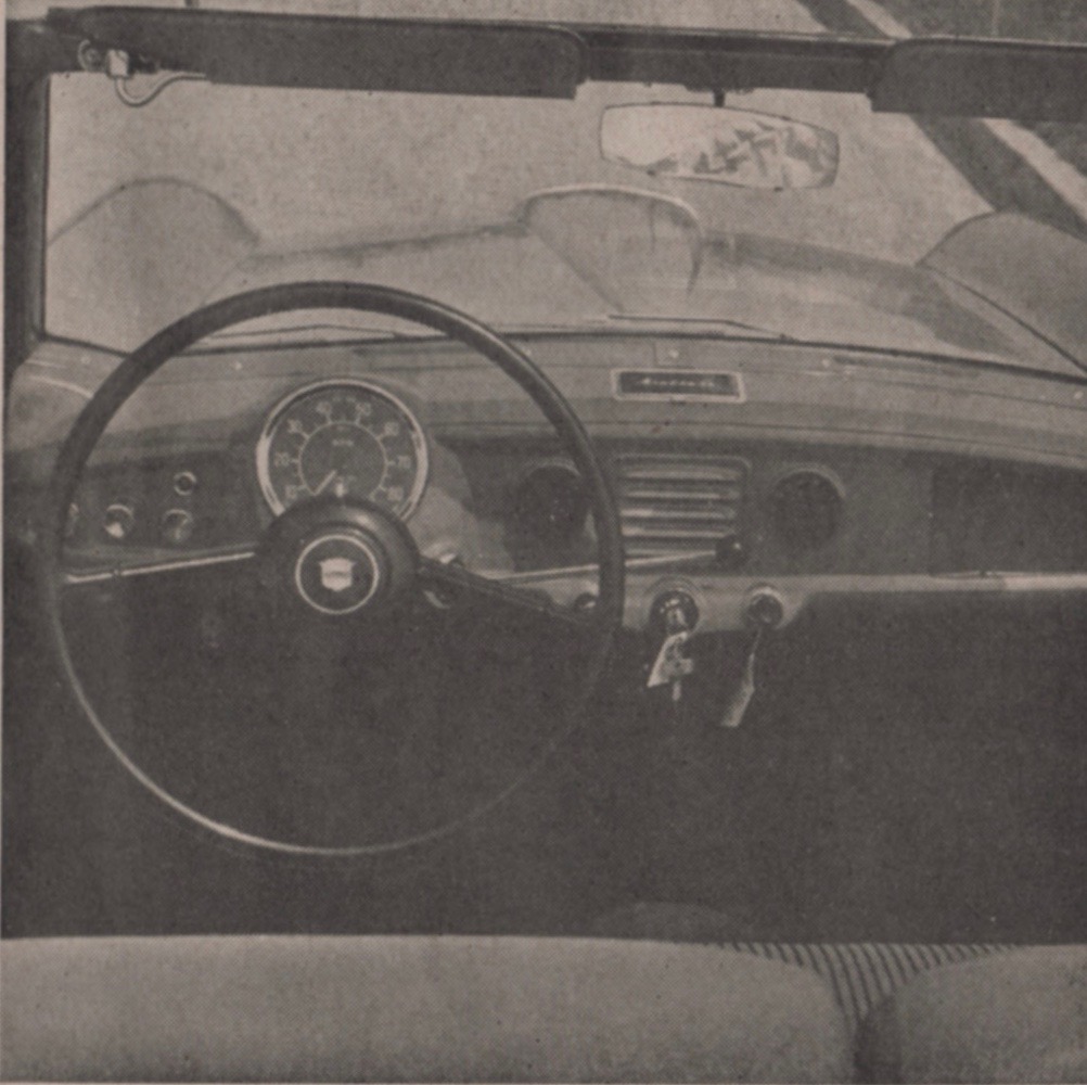 “Visibility in both models,” R&T reported, “is excellent because of the high windshield and roll up windows (which lower the dropped portion for convenient elbow resting ala sports car), and the view over the hood with raised fenders and fake air scoop give one the impression that the car underneath is something big and potent like a Lancia.”