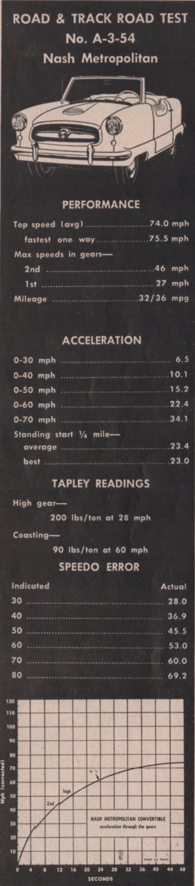 Surprising Performance. “The Metro, for its size,” R&T said, “screams out from lights, and shifts into second and into third require a great deal of practice before one can eliminate the sudden squat in the rear when the higher gears take hold. The speedometer needle flickers upwards fast and it’s quite easy to be hitting 50 mph within a long city block, police and weather conditions allowing.”