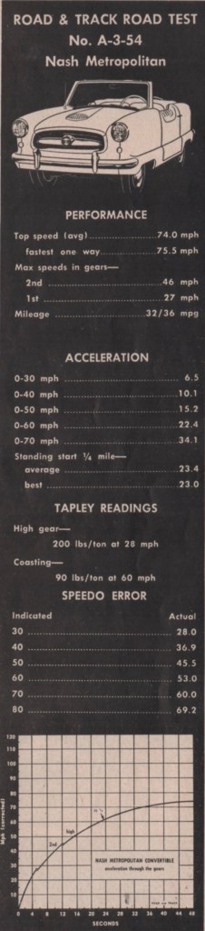 Anglo-American. R&T wrote, “The Metro employs the Austin A-40 power plant and rear axle. The famous Nash unitized frame [recall, most cars then were body-on-chassis] is built for the car by Fisher & Ludlow Ltd. of England and the assembly work on the car is done at the Longbridge works of Austin.”