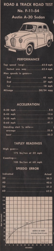 Versus the Beetle. Not that the Volkswagen’s acceleration (39.2 seconds to 60 mph) was all that quicker than the A-30’s 41.1. Indeed, a Letter to the Editor in November 1954, “In Defense of the Austin A-30,” compared R&T’s figures showing the A-30 to be quicker than the VW in the newsboy range.