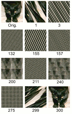 Wikipedia observes, “The original image of the cat is sheared, and then wrapped around in the first iteration of the transformation. After some iterations, the resulting image appears rather random or disordered, yet after further iterations the image appears to have further order—ghost-like images of the cat, multiple smaller copies arranged in a repeating structure and even upside-down copies of the original image—and ultimately returns to the original image.”