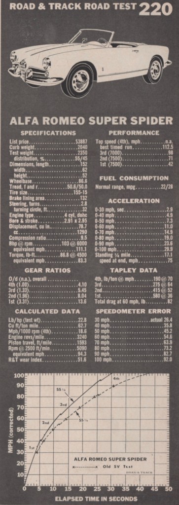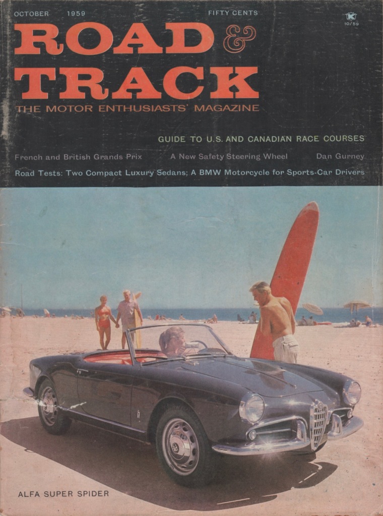 THERE’S A BACKSTORY to R&T’s road test of the Alfa Super Spider, October 1959: The magazine acknowledged, “The Alfa Romeo Veloce Spider test (March 1958) was a classic example of our unwittingly arousing owner anger. The results of the test, which pleased us no end, were evidently not good enough for the Alfa contingent, because what seemed like every Giulietta fancier in the world promptly came down on our heads.”