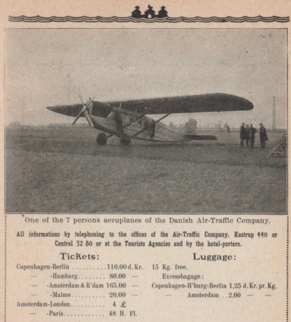 “Where are you going?,” Hiort said. “To Amsterdam, Brüssels, Paris or London? To these places are direct air-lines, reducing the travelling time 1/6 or 1/4 of the ordinary time by rail or water.”
