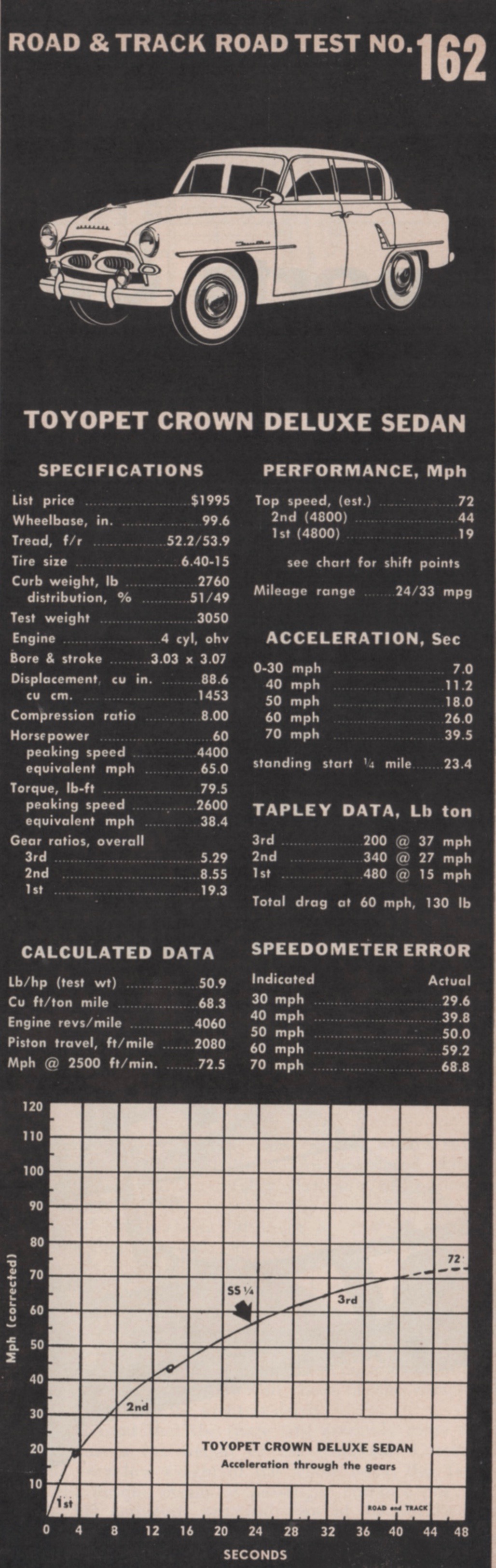 Among the First. “We, in turn,” R&T boasted, “were fortunate in being among the first to see, try and drive this unique new import. Our test car was the first and only sample Toyopet ‘Crown De Luxe’ in the U.S.A. In some respects the car was a favorable surprise, but there were also a few serious shortcomings.”
