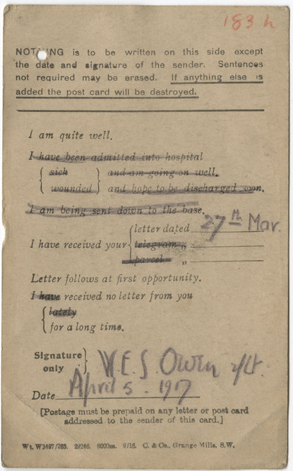Blanks to Fill. Sawday describes, “A. 2042 was designed to be sent to family or friends at home by those on active service. It began by warning that ‘nothing is to be written on this side’ other than the sender’s signature and the date, and ‘if anything else is added the post card will be destroyed.’ It then offered a series of phrases, each of which could be deleted, to create a rudimentary narrative. The opening words, ‘I am quite well,’ could be crossed out or supplemented with more troubling news: ‘I have been admitted into hospital.’ That phrase could then be modified to give a little more information: ‘sick’ or ‘wounded’, then ‘and am going on well’ or ‘and hope to be discharged soon.’ ”