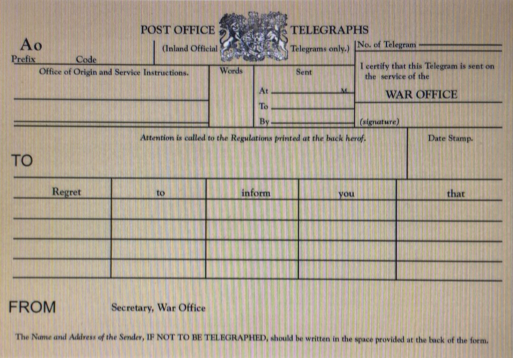 Above, regrets of officer deaths were sent by telegrams. Image from Real Lives. Below, deaths of the enlisted were sent by post. Image from National Army Museum.