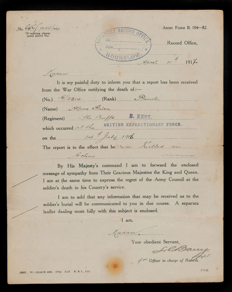 Above, regrets of officer deaths were sent by telegrams. Image from Real Lives. Below, deaths of the enlisted were sent by post. Image from National Army Museum.