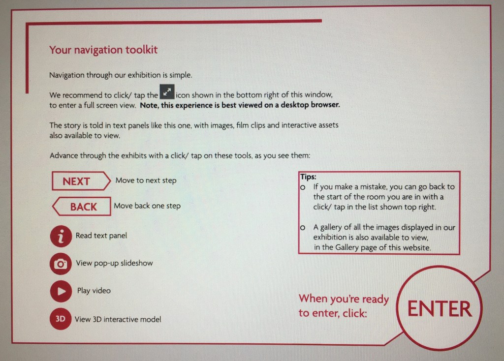 The first stop is a “navigation toolkit” identifying the icons. Agreed, I did my virtual viewing on the iMac 27’s full-screen. And following up on icons enriched the tour, with text accompanying the images, occasional slideshows, videos, and 3D interactive models.