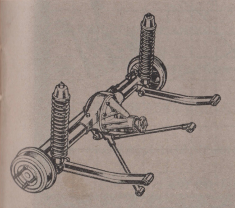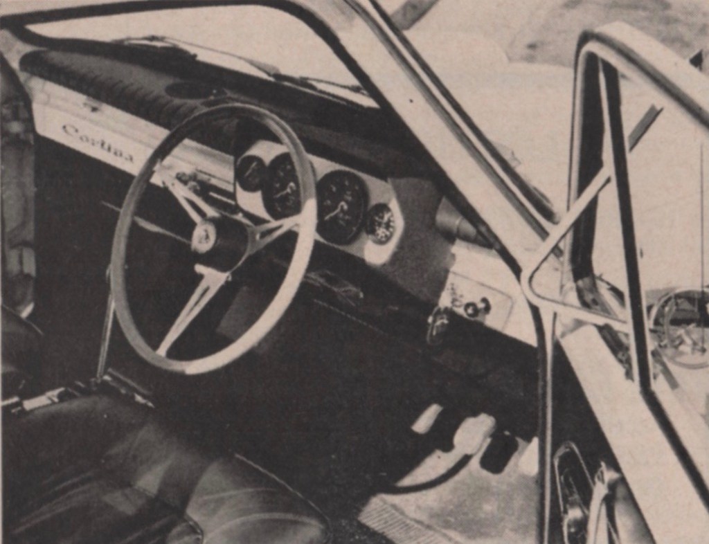 Chapman Struts. “It is evident,” R&T said, “that the complete rear suspension of the stock Cortina was unacceptable to Chapman, as the conventional leaf springs have been thrown out and replaced with coil suspension units. These are retained by trailing radius arms on each side and a central A-frame.”