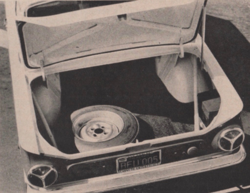 Chapman Logic. R&T noted, “Another modification is the aluminum differential housing to reduce unsprung weight, and two tubular strengthening struts inside the trunk. To improve the weight distribution and permit more room under hood, the battery has been relocated in the trunk and the spare wheel lies flat on the floor instead of being carried upright.”