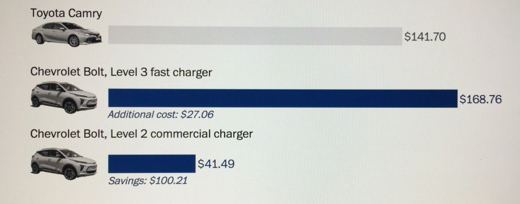 “Did the EV hold its edge? Sometimes. But not always,” Coren reports. “If I was refueling at homes or cheap Level 2 commercial stations along the way (an unlikely scenario), the Bolt EV was cheaper to refuel: $41 compared to $142 for the Camry.”
