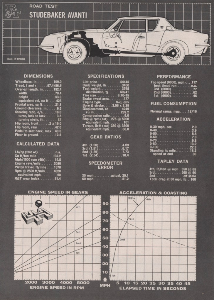 An Optimized Test Car? R&T’s Avanti had the optional Paxton supercharger, the 4-speed manual (not the 3-speed manual nor ditto automatic), and the optional 4.09:1 axle ratio (shortest/highest numercally; a 3.73 was standard). Acceleration profited from these: 0-60 in 7.3 seconds and quarter-mile results of 16.2 seconds at 88 mph.