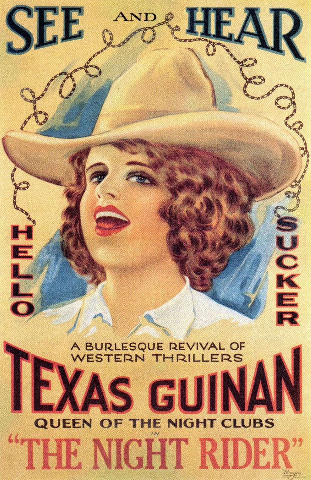 Indeed, Wikipedia observes that Guinan’s film career had her “at the vanguard of women filmmakers in the United States…. During her years with Bull’s Eye Productions/Reelcraft, she began to expand towards the production end of film-making, as a unit department head on the films OutwittedThe Lady of the LawThe Girl of the RanchoThe Desert Vulture, and at least five other productions. She created Texas Guinan Productions in 1921 to produce Code of the WestSpitfire and Texas of the Mounted. After I Am the Woman and The Stampede for Victor Kremer Film Features, she returned to New York.”