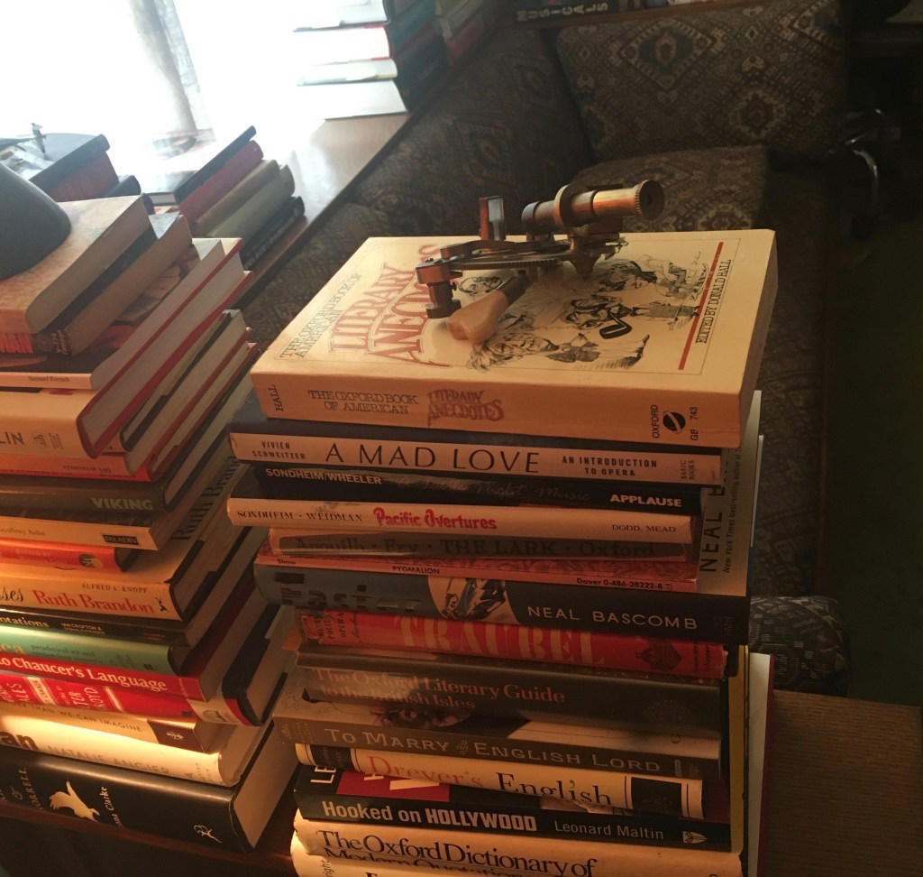 That fascinating stack of books aside, we also need to hear about the sextant (is that right?) on the top. And thanks for the great Benchley anecdotes.